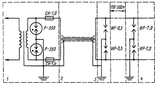 4.1. Кабельные вставки и катушки пупинизации, которые могут быть включены в разрез воздушных и смешанных линий ПВ, должны быть защищены от опасных напряжений, возникающих при грозовых разрядах, разрядниками ИР-0,3 и ИР-7,0, включенными по схеме, указанной на черт. 6.