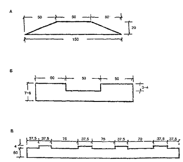 А - желтая резиновая лента; Б - поперечное сечение окрашенной ленты, выполненной из термопластика; В - продольное сечение ребристого покрытия