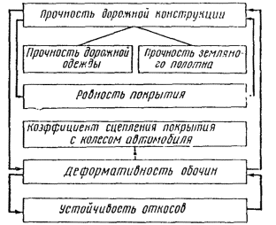 1.1.3. Основными технико-эксплуатационными качествами дорожных одежд и земляного полотна, которые характеризуют их состояние, являются (рис. 1.1) ровность покрытия проезжей части, прочность дорожной конструкции, шероховатость покрытия проезжей части, деформативность обочин, устойчивость откосов земляного полотна. Все эти качества необходимо рассматривать в комплексе, поскольку ухудшение какого-либо из них, как правило, оказывает влияние на условия движения.
