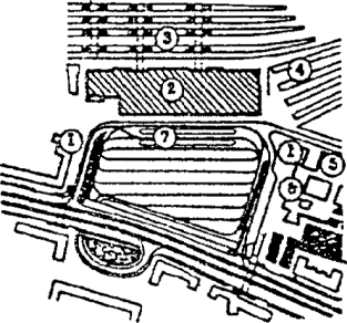 А - разрез, Б - план подземного этажа; 1 - подземные пассажирские платформы; 2 - подземные переходные мостики над железнодорожными путями; 3 - наземный распределительный зал-вестибюль; 4 - кассы; 5 - входы и выходы; 6 - учреждения обслуживания пассажиров; 7 - проезды