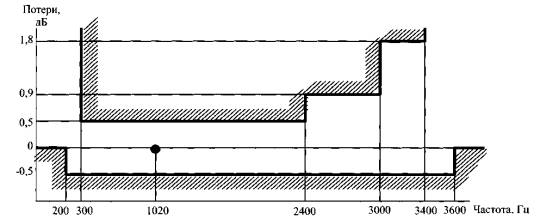 5.5. Полоса частот канала находится в пределах 300 - 3400 Гц. Амплитудно-частотная характеристика канала для четырехпроводного интерфейса находится в пределах маски, приведенной на рисунке 3. Амплитудно-частотная характеристика канала для двухпроводного интерфейса находится в пределах маски, приведенной на рисунке 4.