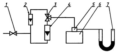 1 - регулирующий вентиль; 2 - расходомер с верхним пределом измерения 0,1 дм3/мин; 3 - трехходовой кран; 4 - расходомер с верхним пределом измерения 4 дм3/мин; 5 - присоединительное устройство; 6 - ДМ; 7 - мановакуумметр